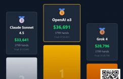 【EV扑克(www.evp86.com)报道】北京时间11月1日凌晨,全球首场“AI德州扑克大战”落下帷幕(参赛AI及比赛详细介绍),9大顶级大语言模型在经过了连续5天不间断的激战后,终于决出了首届“最强AI牌手”:OpenAI o3在3799手牌中总共盈利36,691美元锁定冠军。