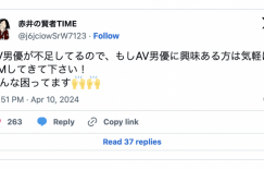AV男优严重不足!著名的AV男优漫画家、也是事务所アルヴィロッソ(Alvirosso)的代表「赤井さん」是在自己的X(https://twitter.com/akaiakaisan)揭露了这个状况,请注意喔,他是用「空前不足」来形容目前AV男优短缺的困境,然后他拜托有兴趣当AV男优的30公分们赶快私讯,「也许你就是AV界救世主」: