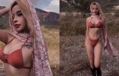 荒野中雜草叢生,卻在這種情景下吸住了所有人的目光,眼前穿著橙色比基尼的長髮尤物就是「南湘Wendy」,頭上披著紅色方巾,還是難掩那小巧又精美的臉蛋,尤其深邃帶電的眼神,一個回眸就讓人神魂顛倒,還有凹凸銷魂的曲線,確實在荒蕪中增添了滿滿風采! (圖片來源: ▶ ▶