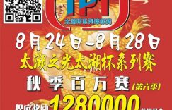 TPT太湖之光之太湖杯系列赛秋季百万赛(第六季)将于2023年8月24日至8月28日,在无锡太湖之光智竞运动馆举办,保底128w旅游基金,冠军保底28.8w旅游基金,比赛所有奖励当场发放,所有成绩计入中扑榜,最强牌手全程视频直播。