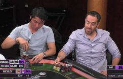 ←Wesley | Airball→盲注级别$100/$200/$400,Ante(大盲前注,指发牌前包括大盲和小盲玩家在内的每个玩家必须投入的强制下注)$200。两位玩家的有效筹码量约为$800,000,这意味着他们在玩一个筹码深度高达2000BB的带Straddle的游戏。