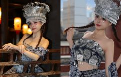 現在出國都非常流行換上當地的傳統服飾,體驗該國的風俗民情!這次就在上海發現一位來自台灣的正妹「羊ㄦ」,換上銀光閃閃的苗服,厚重的金屬頭飾下是一張小巧白皙的可愛臉蛋,黑白色的兩截式套裝,不只露出纖瘦的香肩與水蛇腰,連飽滿的北半球也快要蹦出來! (圖片來源: ▶ ▶